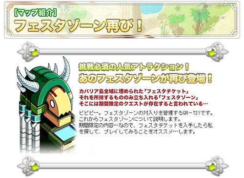上記期間限定で、特別クエストを受けることができるマップ「フェスタゾーン」が出現します。このマップには、カバリア島全域で発掘可能なアイテム「フェスタチケット」を所持し、規定の場所にいるNPCに話しかけることにより入場することができます。